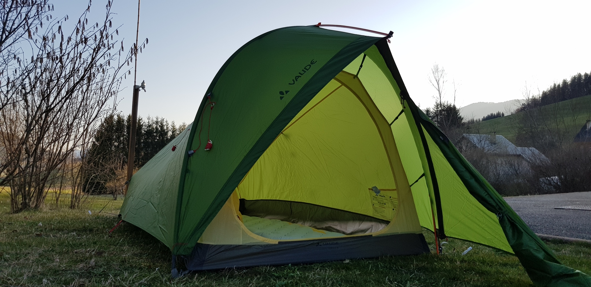 Ce qui est séduisant dans ce modèle Vaude, c’est le montage en simultané du double-toit et de la chambre intérieure. C’est un point fort lorsqu’il pleut : la chambre intérieure n’est pas mouillée le temps de la mise en place de la toile extérieure. Le montage est simple et rapide ; il suffit de glisser les arceaux dans les fourreaux.